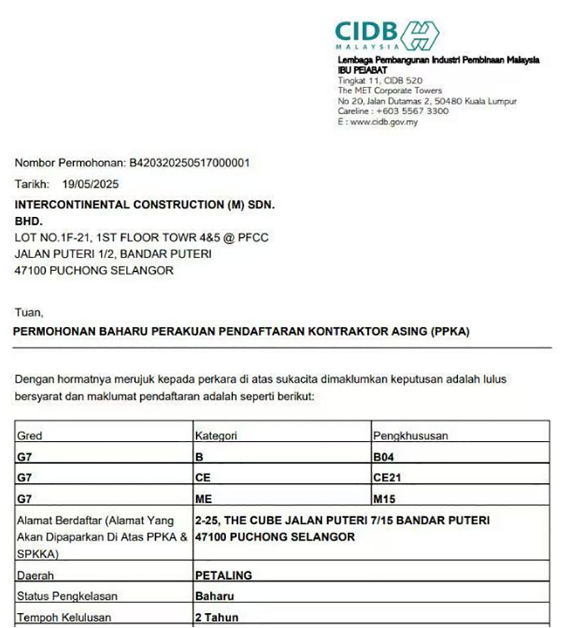 近日,經(jīng)馬來(lái)西亞建筑工業(yè)發(fā)展局(CIDB)批準(zhǔn),合景建設(shè)集團(tuán)有限公司全資子公司洲際建設(shè)(馬來(lái)西亞)有限公司取得馬來(lái)西亞最高等級(jí)G7承包商資質(zhì),包括土木工程(CE21)、土建工程(B04)、機(jī)電工程(M15)以及各種機(jī)械工程等多項(xiàng)內(nèi)容。這是合景建設(shè)在馬來(lái)西亞建筑資質(zhì)領(lǐng)域的重大突破,意味著公司在智慧建筑領(lǐng)域的技術(shù)實(shí)力、屬地化服務(wù)能力及行業(yè)影響力獲官方權(quán)威認(rèn)可。